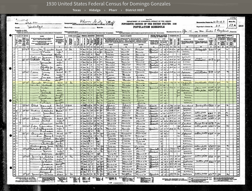 The 1930 Census was the earliest U.S. record I could find for my paternal great-grandfather, Domingo González. He was 56, married to Antonia, 44, and eight of their nine children were living with them in Pharr, Texas, ranging between the ages of 5-23. (Their oldest son Leopoldo was in his mid-20’s living on his own.) From this Census record, I can also see that Domingo’s birthplace was Mexico and the year he immigrated to the U.S. was 1910. He was a carpenter who spoke primarily Spanish and had limited reading and writing capabilities.