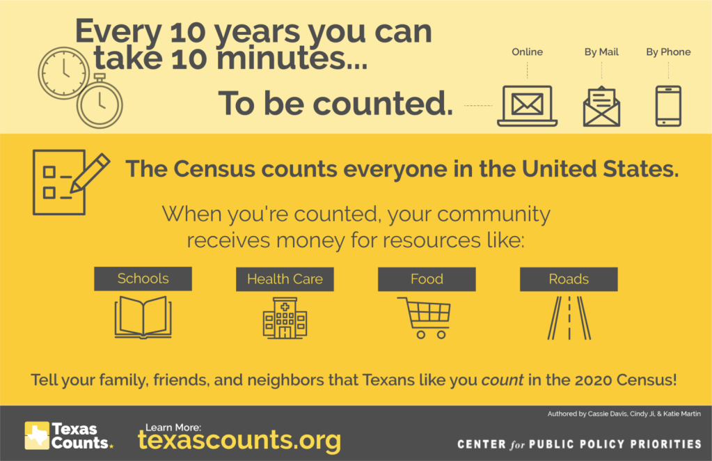 Complete the 2020 Census today and tell your family, friends, and neighbors to make sure Texas Counts!